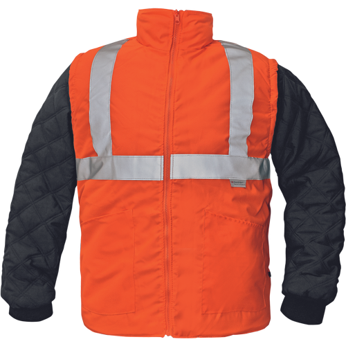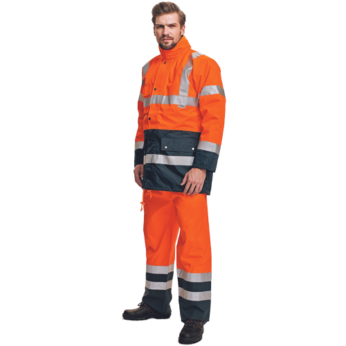 • men’s HI-VIS waterproof winter jacket 4 in 1, breathable • removable separately wearable upper windbreaker with hood in a collar, taped seams • 3M reflective stripes across shoulders and around chest, hips and sleeves • 2 big front pockets, 1 small chest pocket • inner jacket with detachable sleeves and knitted cuffs, can be used as HI-VIS vest