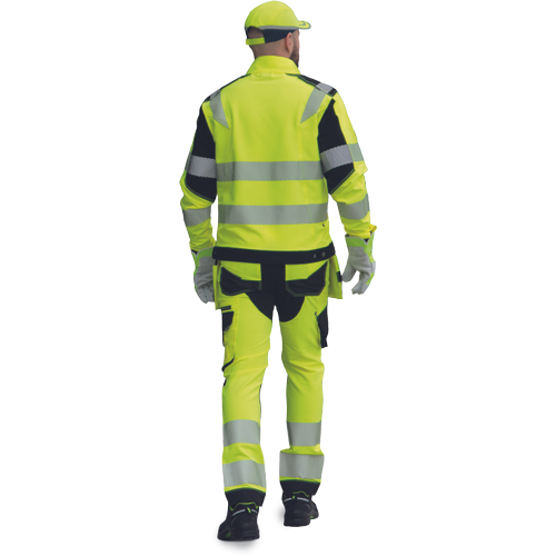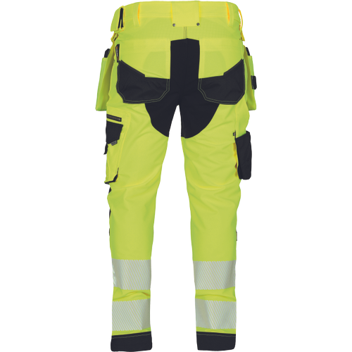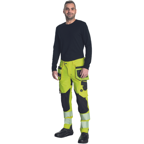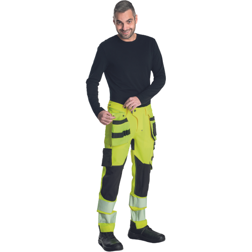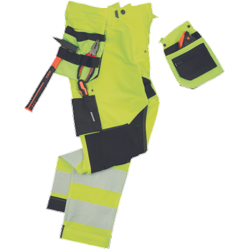 • men’s working HI-VIS pants made from unique four-way stretch material Trifibetex-VIS®, enhanced by 2 swing multifunctional detachable pockets • 2 front wedge pockets • 2 back patch pockets with velcro closing • large multifunctional pocket on the left thigh • multifunctional ruler and knife pockets on the right thigh • CORDURA® reinforcement at knee areas with optional knee pad insertions • durable triple stitching on legs and crotch • elastic waist • adjustable legs length • 7.5 cm wide printed and segmented reflective stripes • tone-on-tone details
