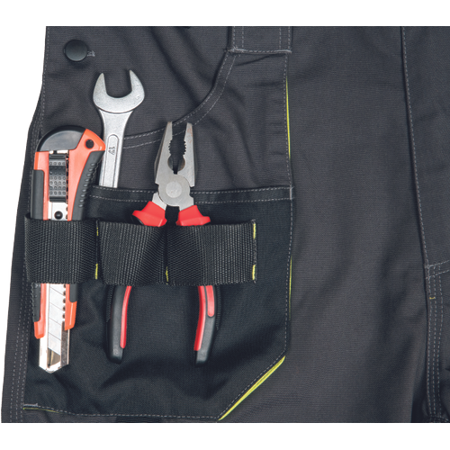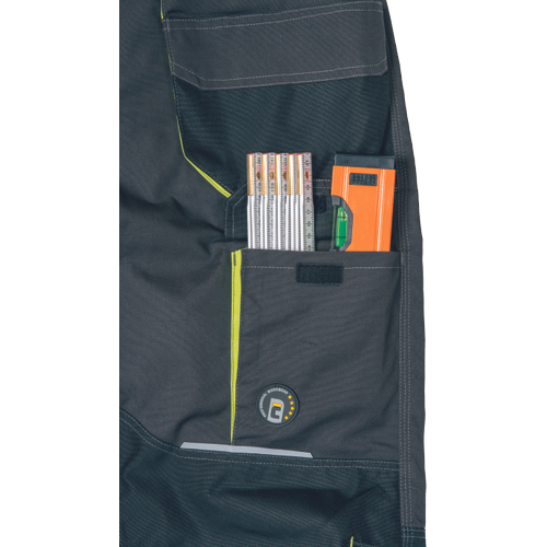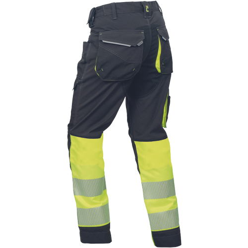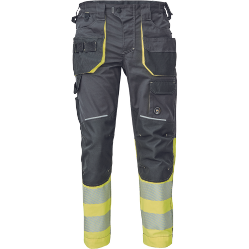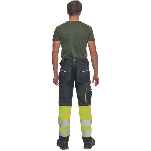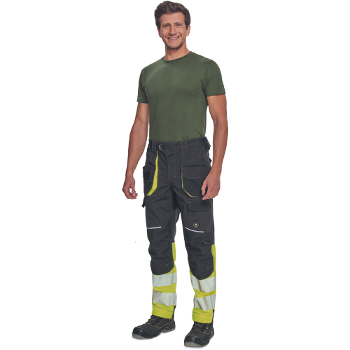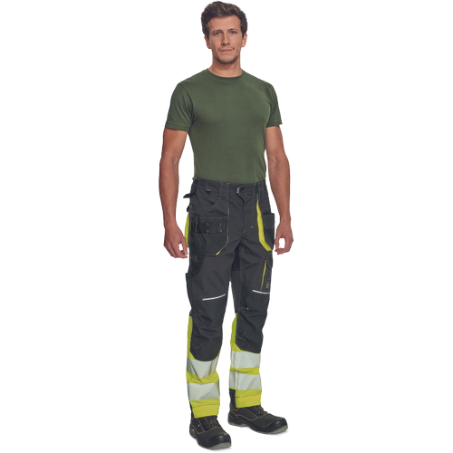 • men’s workwear HI-VIS pants with elastic waist and multifunctional pockets • Oxford 600D reinforcement of knee pockets for knee pads insertion • durable triple stitching of legs and crotch • reflective piping, bottom leg with 7 cm reflective printed and segmented stripes • extendable legs length