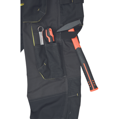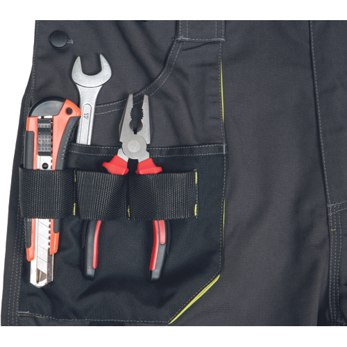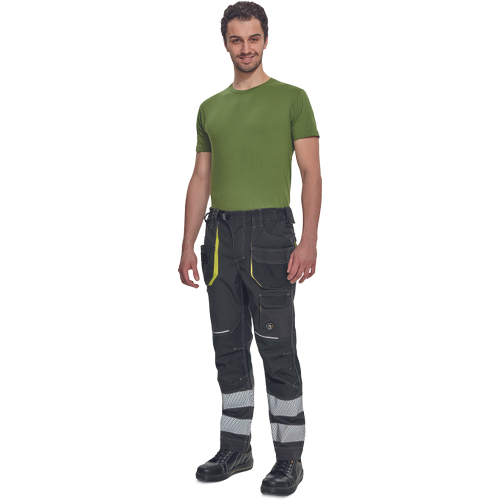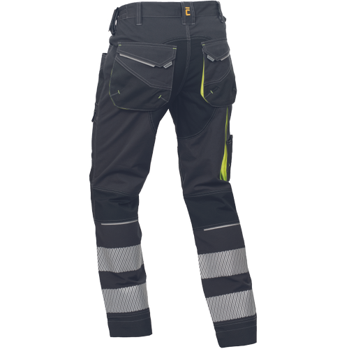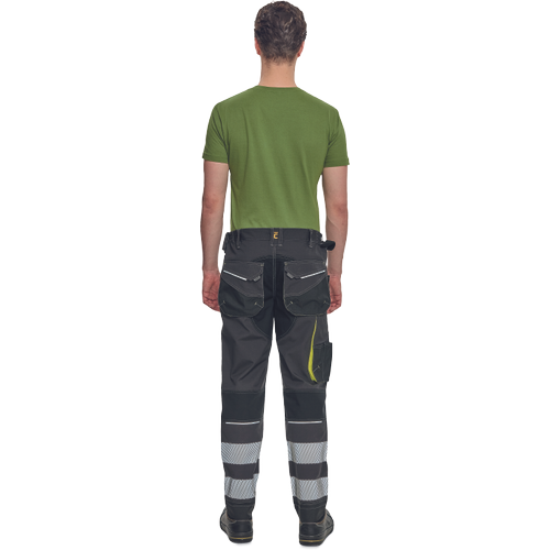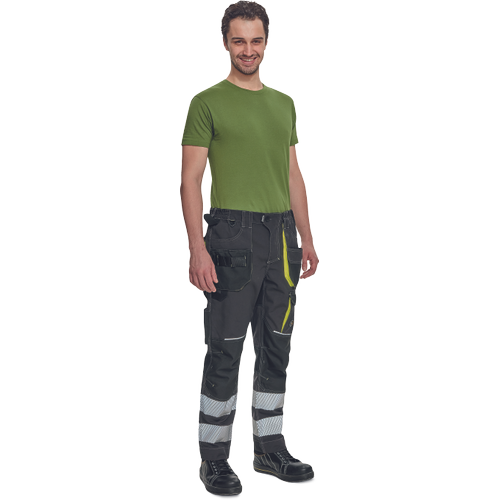 • men’s workwear pants with elastic waist and multifunctional pockets • Oxford 600D reinforcement of knee pockets for knee pads insertion • durable triple stitching of legs and crotch • reflective piping, bottom leg with 7 cm reflective printed and segmented stripes • extendable legs length