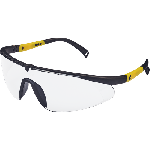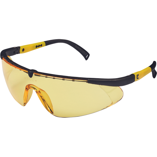 Optical class 1 sport look glasses with polycarbonate lens with anti-scratch, anti-fog coating (class F according to EN 166 standard), small energy shock protection and adjustable temple length. Yellow lens has a UV protection filter according to EN 170 standard, grey lens has a sunglass filter according to EN 172 standard.