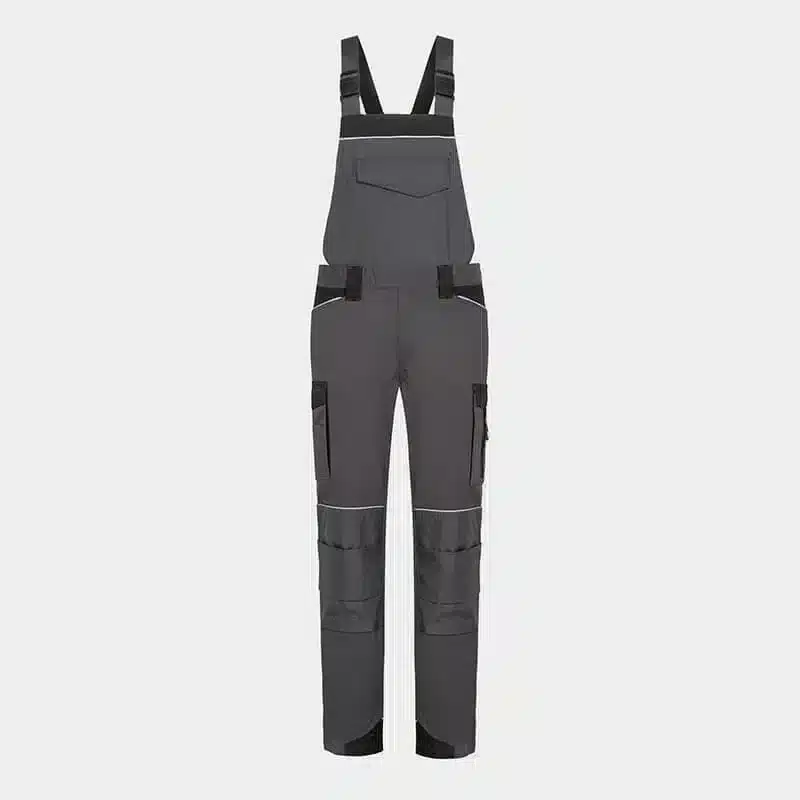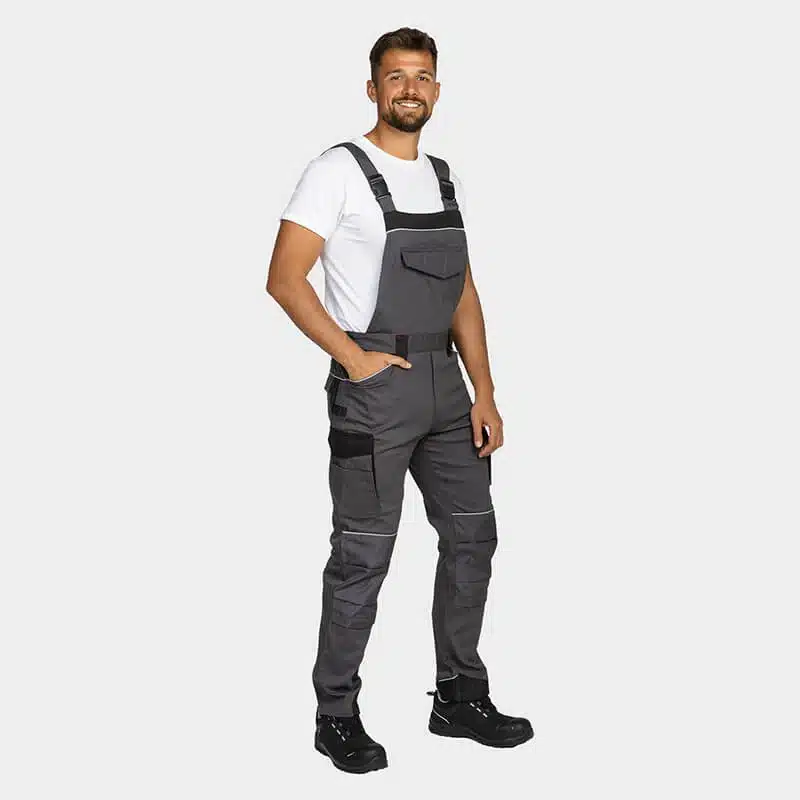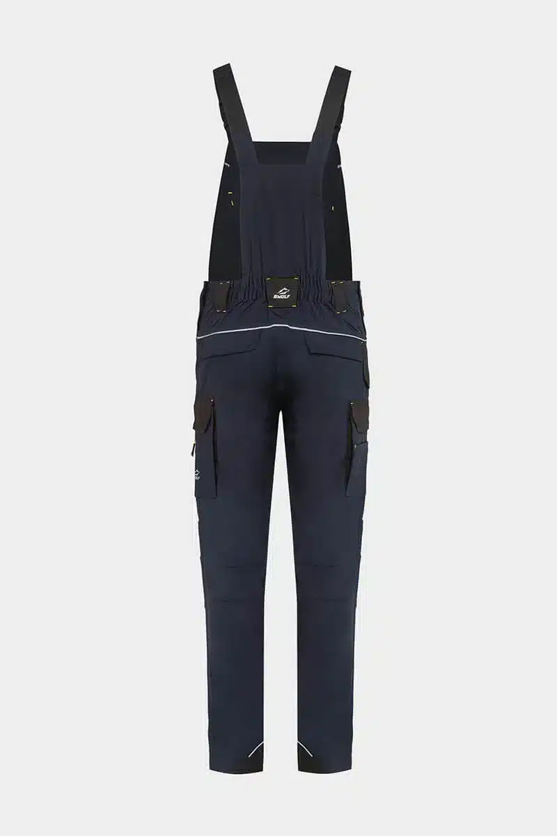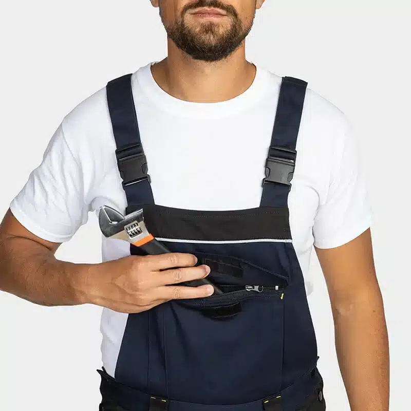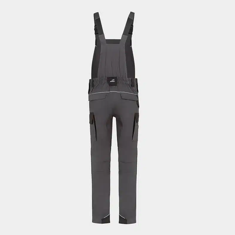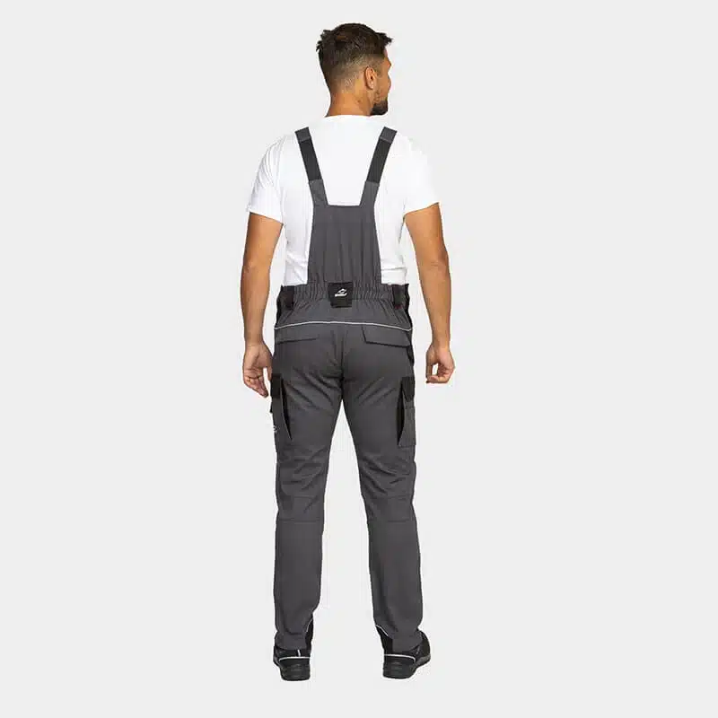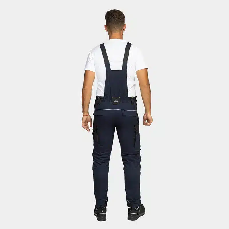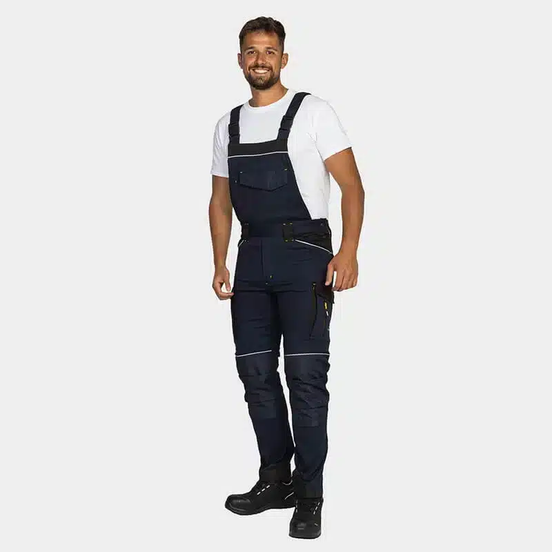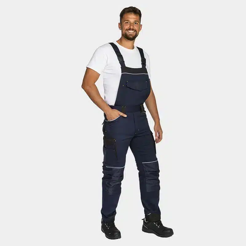 Work salopette, made from comfortable and breathable cotton fabric blended with elastane for enhanced flexibility. Reinforced knees and legs, made with durable Oxford 600D fabric, ensure exceptional strength and durability. Reflective details with RE-FLECT technology enhance visibility in low-light conditions, improving safety. The salopette offers ample storage options, including multiple pockets and knee pockets designed to accommodate knee pads for added comfort and protection. Partially elastic shoulder straps provide a snug yet flexible fit, ensuring comfort throughout the workday.